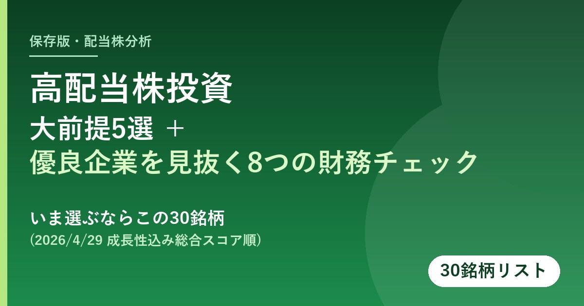 この記事では、高配当株投資で失敗しないための 「大前提5選」 を整理した上で、私が長期でウォッチしてきた日本株候補群(82銘柄)の中から 「いま組むなら」 という視点で、2026年4月29日時点の予想配当利回り+過去4年の成長性+増配傾向の総合スコアで30銘柄をピックアップしました。今回のリバランスでは銘柄候補リストの更新により、新たに7銘柄が30選入りしています。